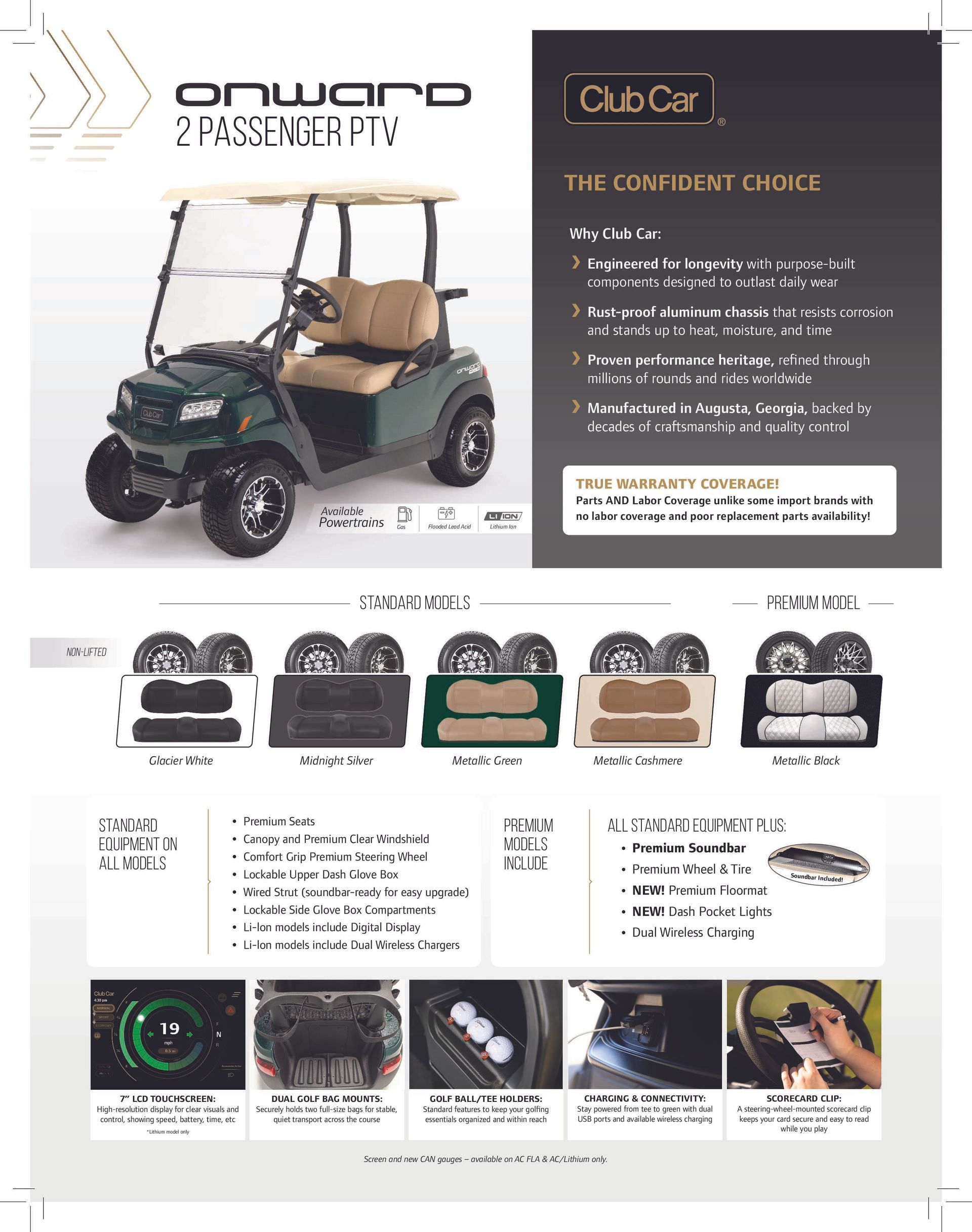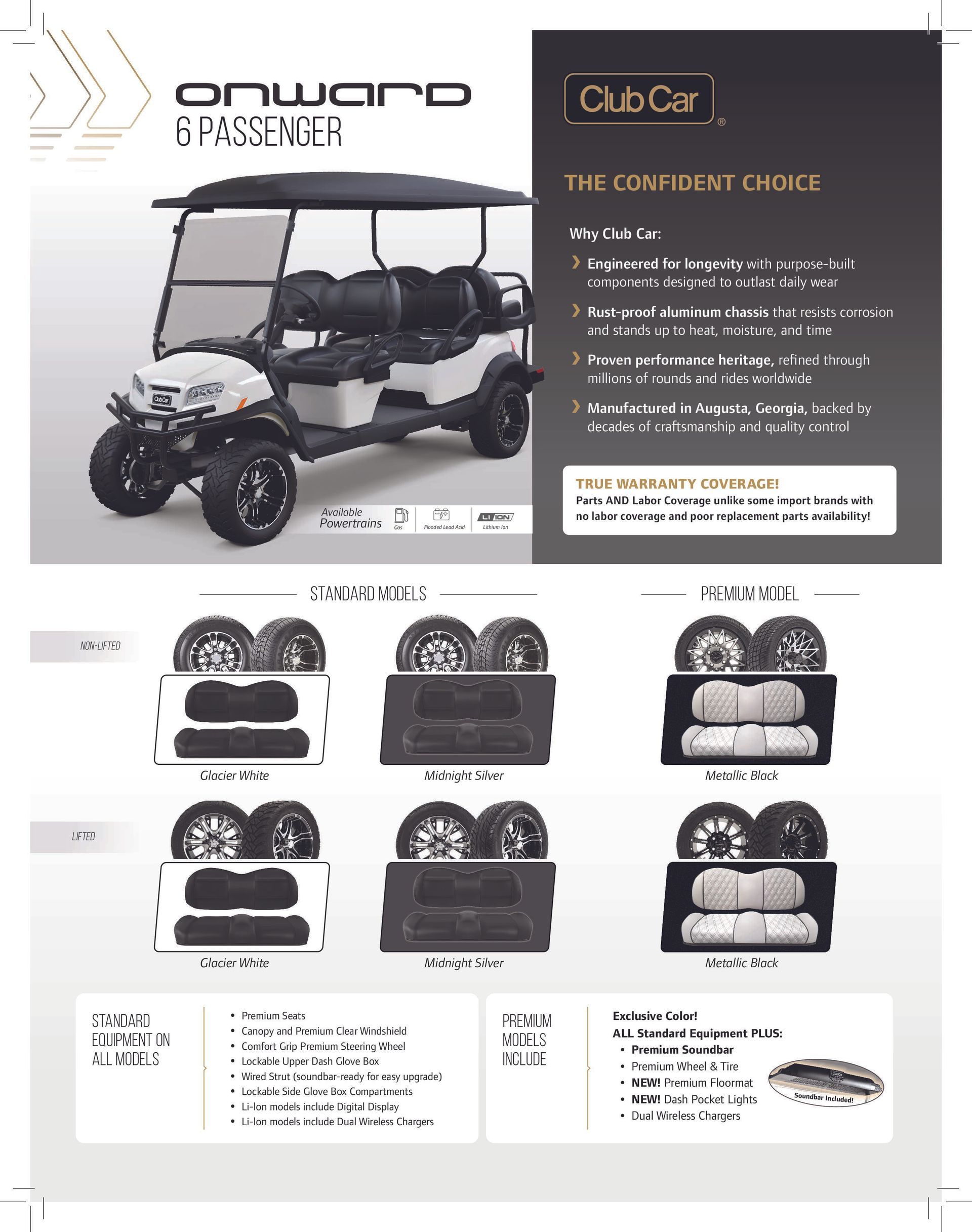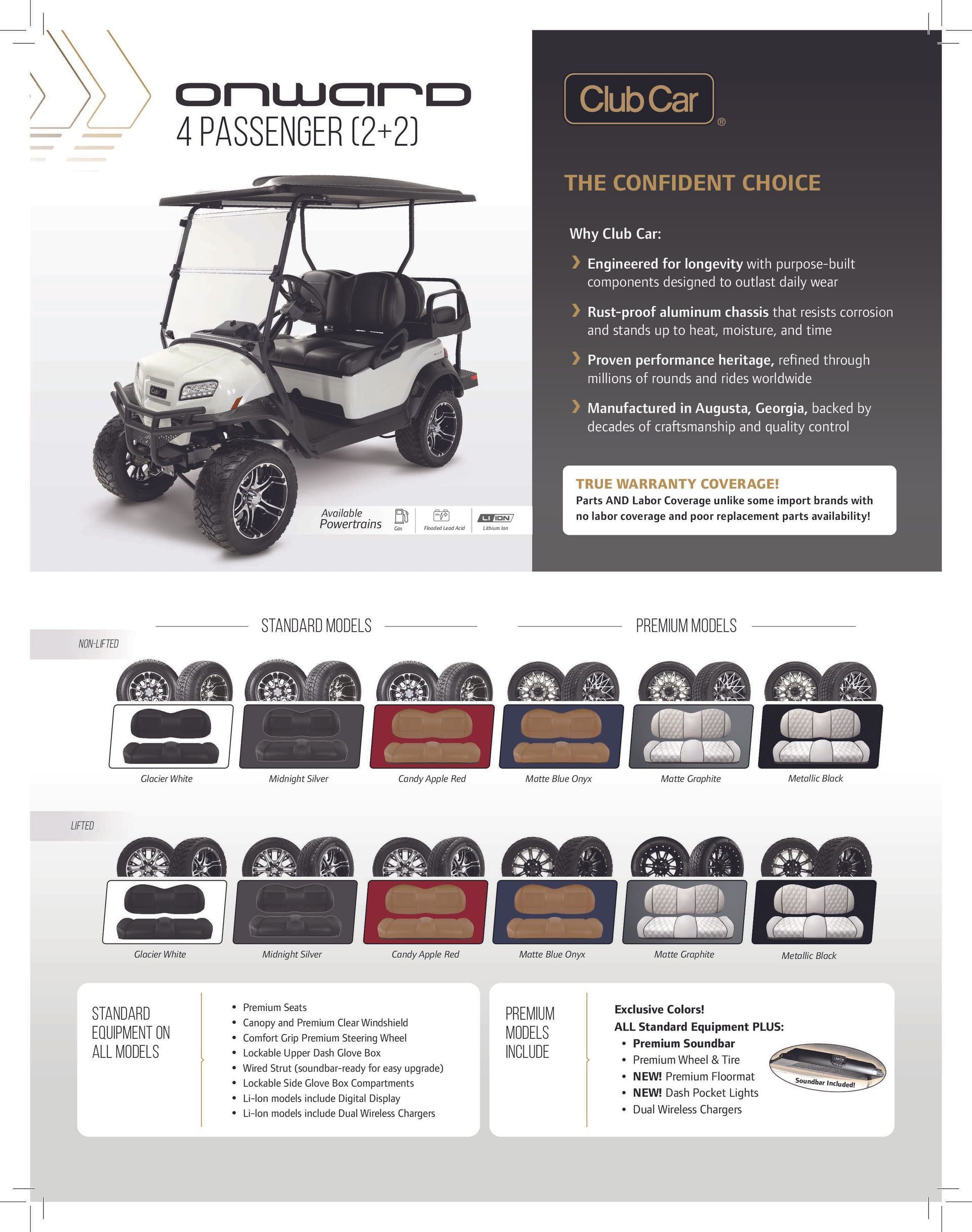 Offered in 2 passenger, 4 passenger, and 6 passenger models there is a configuration to meet any need. Now available in Standard and Premium models with option of gas, electric FLA, lithium-Ion, and Lithium XR drivetrains.