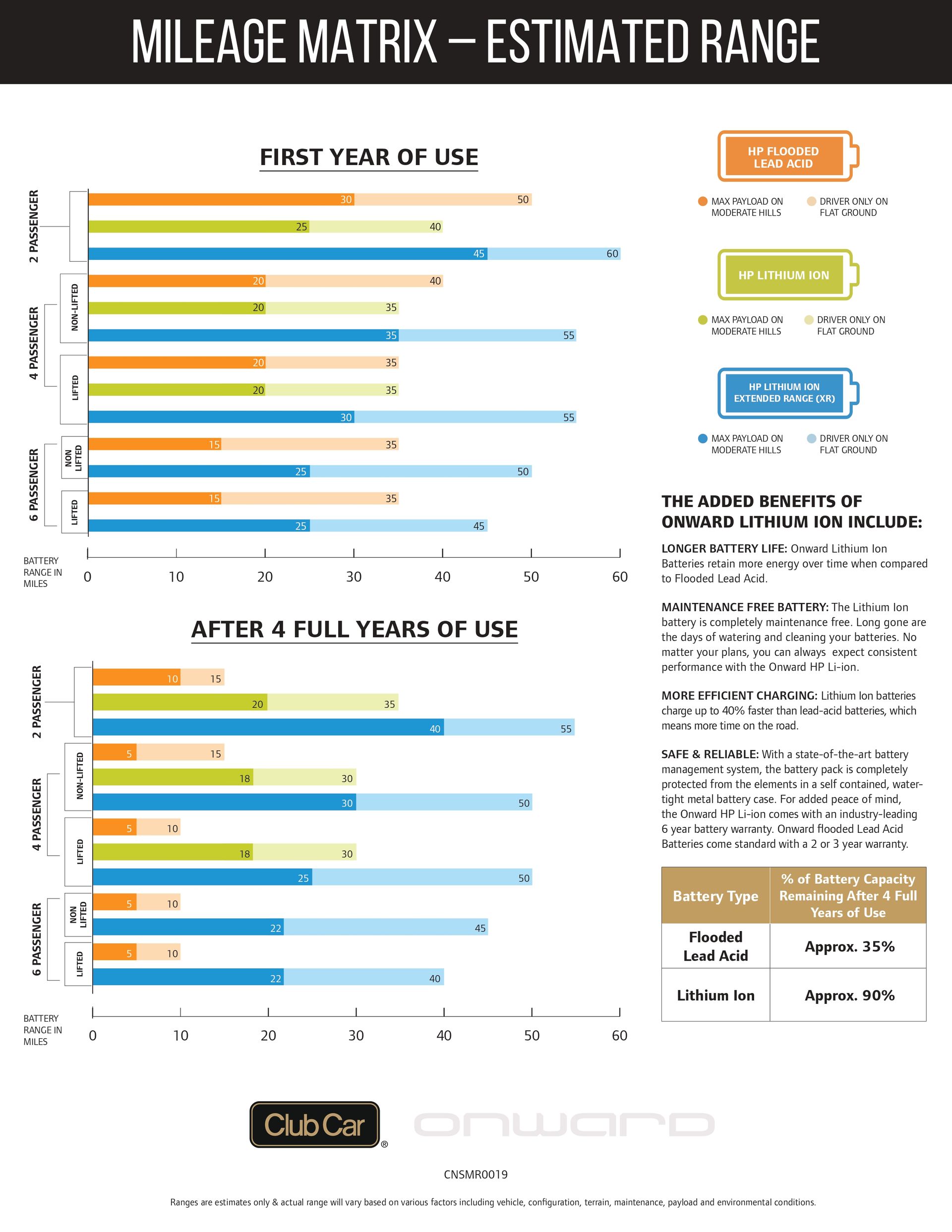 Available in gas, standard electric, AC-drive, and lithium so you’re able to choose what’s best for your lifestyle! Get the leading battery option with the High-Performance Lithium-Ion powered Onward, which delivers outstanding performance with increased hill-climbing power and acceleration. Maintenance-free battery with state of the art management system.